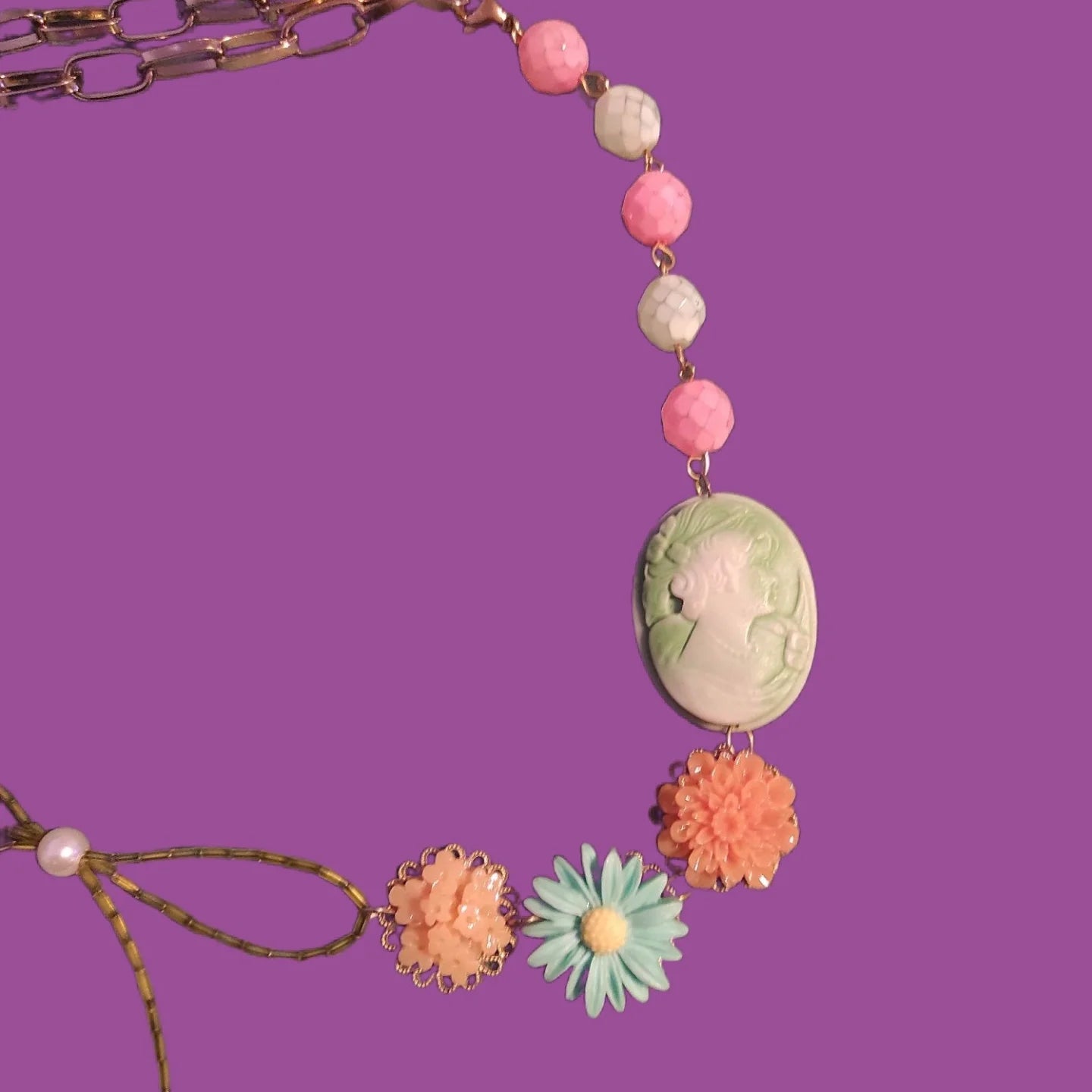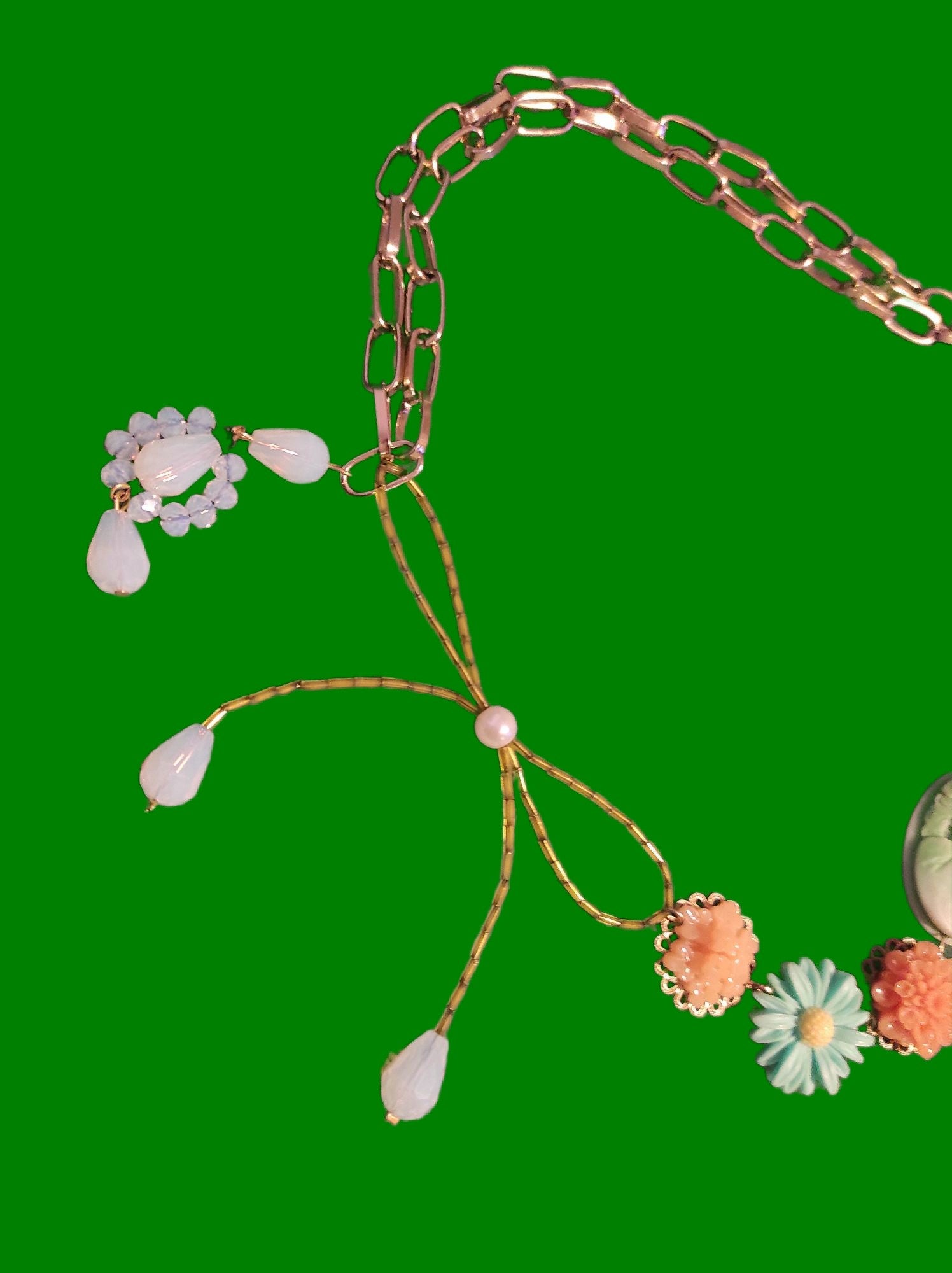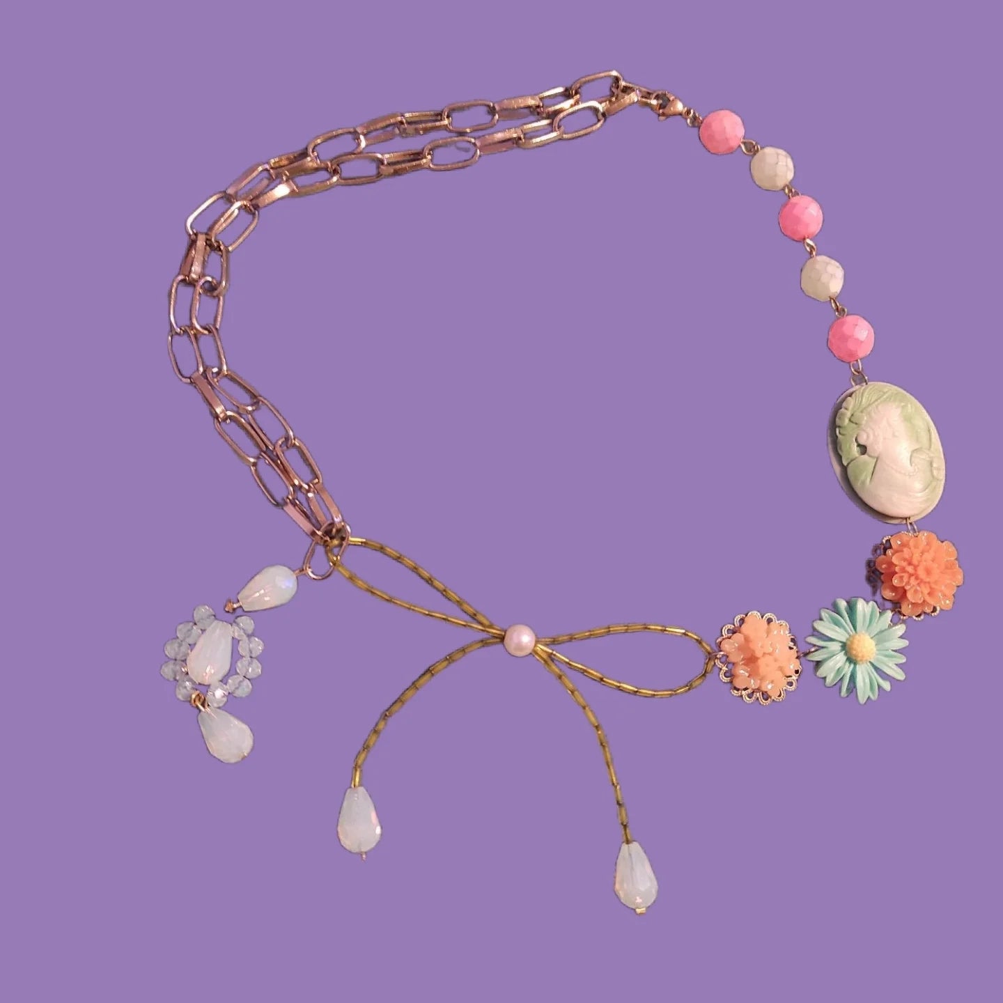 Statement necklace with vintage components, stainless steel chain, Chez crystals and beaded xl bow